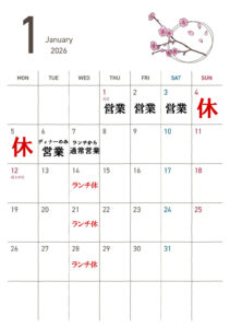 1/7(水)は水曜日ですがランチタイム営業しますので合わせてよろしくお願いいたします